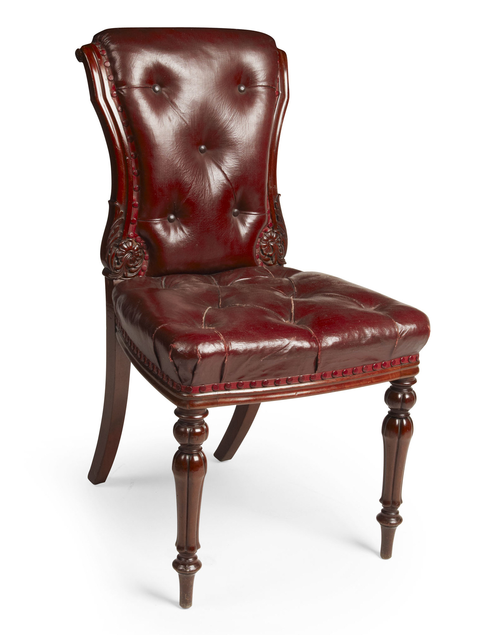 covered in buttoned faux red leather, the foliate carved scroll backs and stuffed over seats raised on raised on reeded turned tapered legs, one chair signed on seat rail