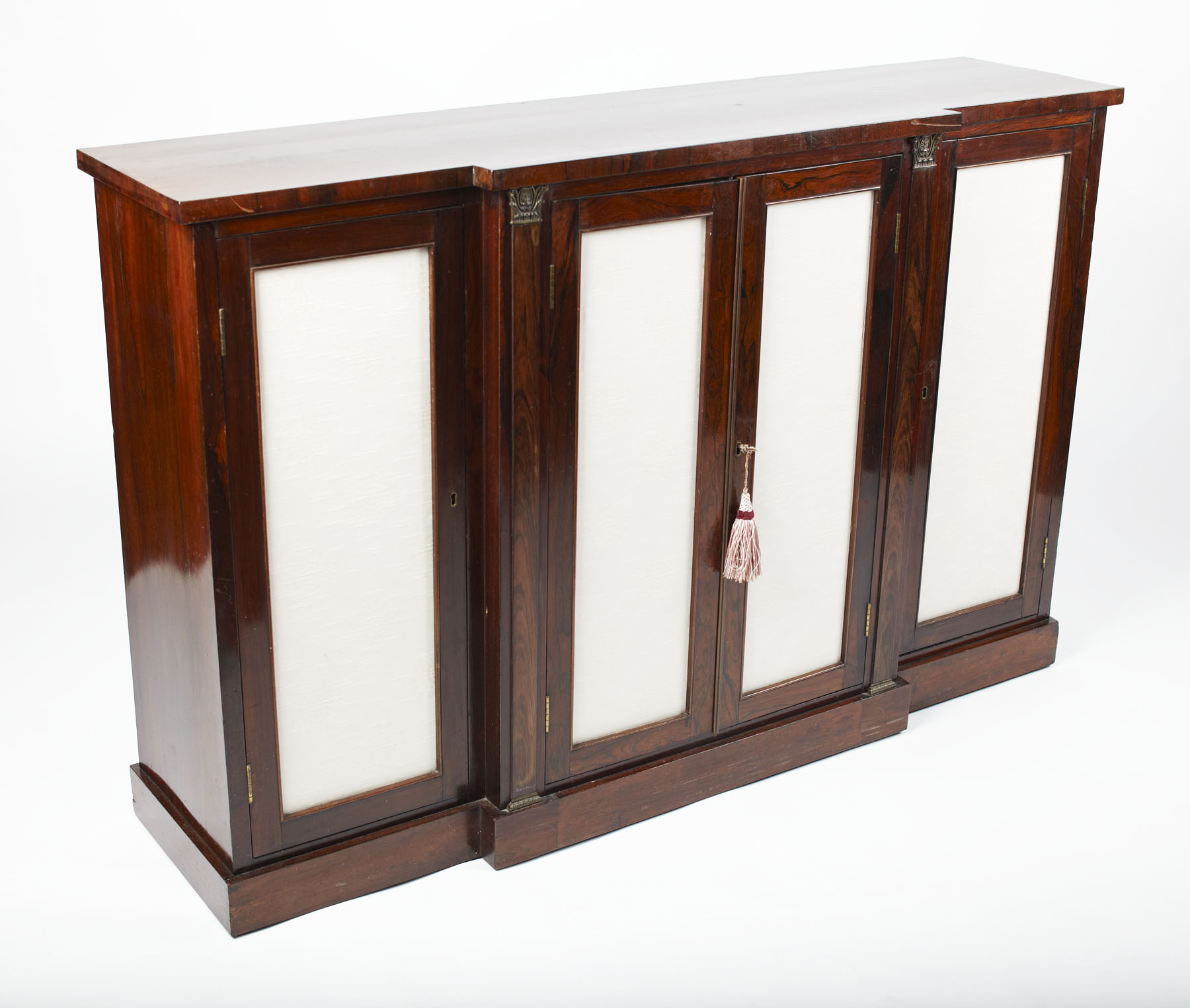 the inverted breakfront top above open adjustable shelves and two grille panel doors, enclosing further adjustable shelves, raised on later bun feet