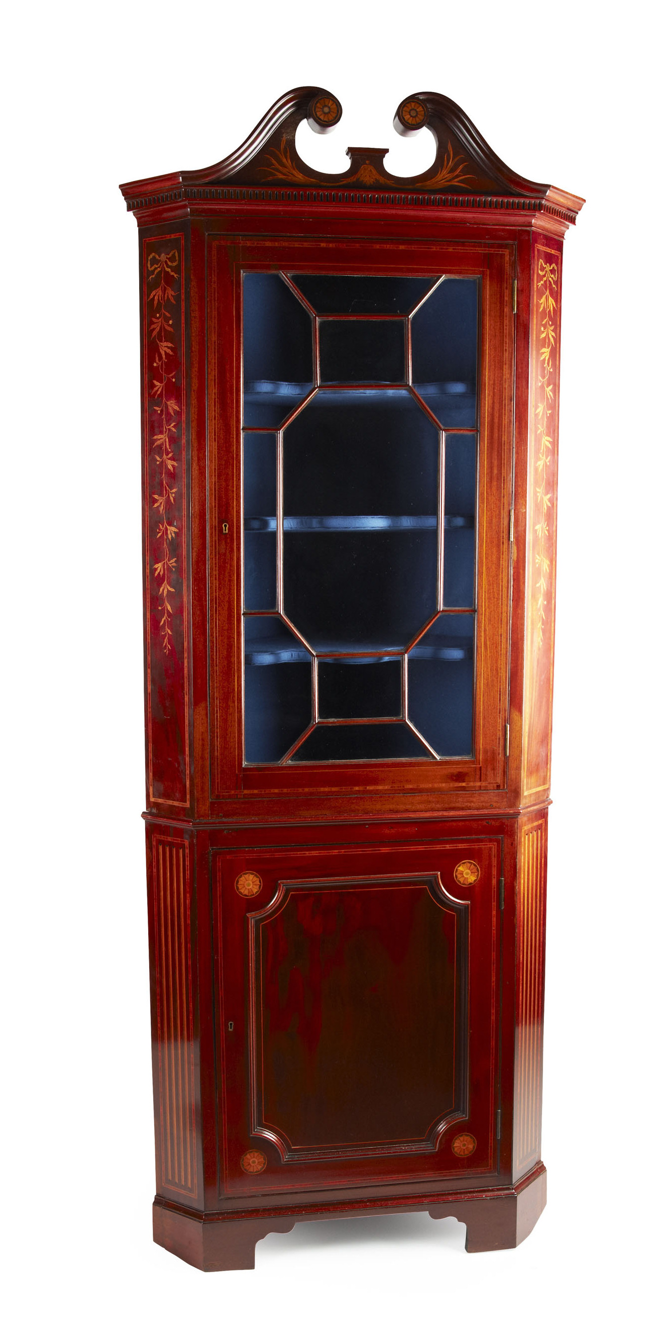inlaid with ribbon tied berried foliage and paterae, the broken swan-neck pediment above an astragal glazed panel door enclosing shelves, the lower section with a further panelled cupboard door flanked by simulated fluted corners, raised on bracket feet