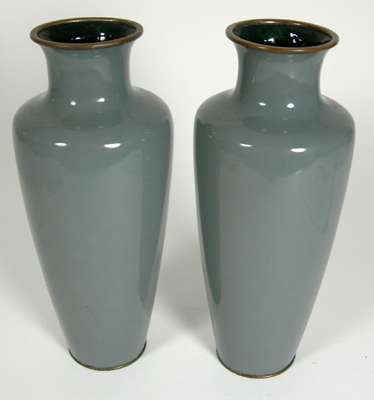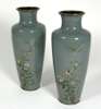each with flared neck above tapering cylindrical body, decorated with kingfishers sitting amongst bamboo and flower blossom on a grey ground (2)