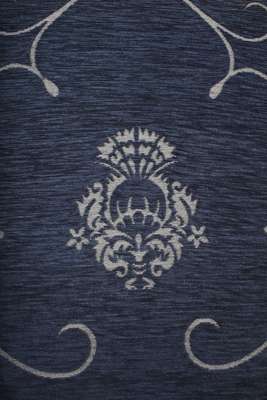 including one armchair, covered in foliate patterned blue fabric, raised on cabriole legs with stylised foliate carved decoration, ending in faceted pad feet (10)