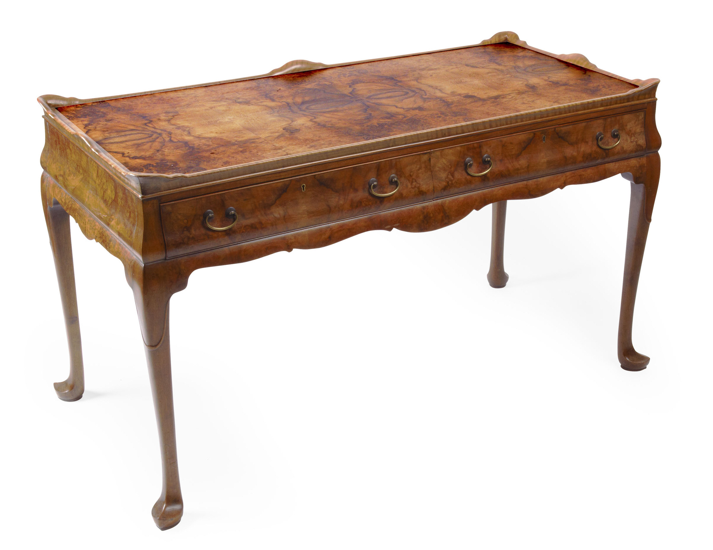 the rectangular top with matched burr veneers enclosed by shaped three-quarter gallery raised above an ogee frieze with two drawers, on cabriole legs with lappet-carved capitals, terminating in pointed pad feet