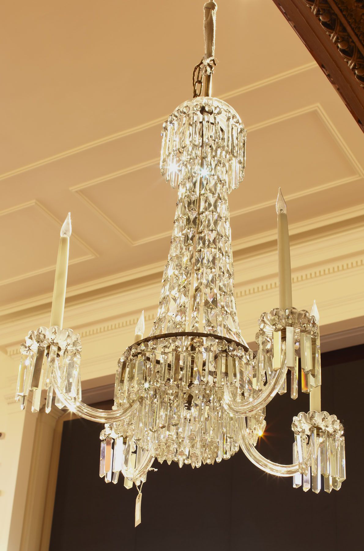 the domed corona hung with a curtain of faceted drops united by a circular lacquered brass band from which issue four outscrolling branches with prism drops