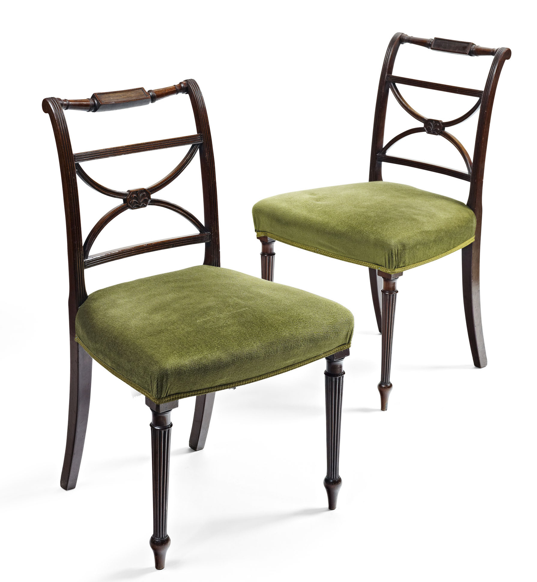the reeded X-form backs centred by palmette motifs, above stuffed over seats raised on reeded turned tapered legs (4)