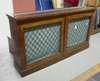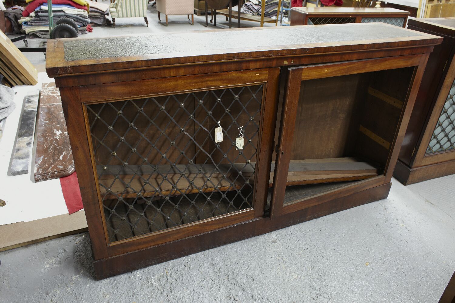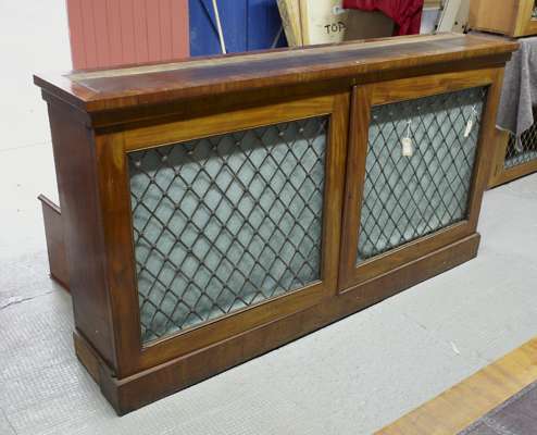 the inset leather tops above a pair of brass grille panel doors, raised on plinth bases