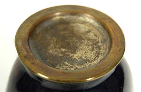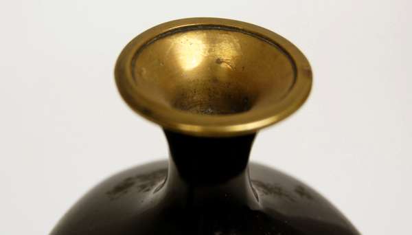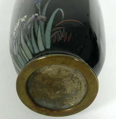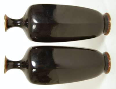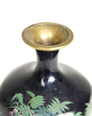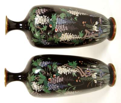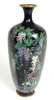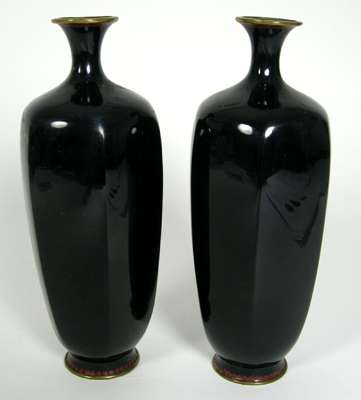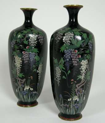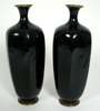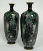each with flared rim above narrow neck and tapering hexagonal body, decorated with wisteria and swallows on a dark blue ground (2)