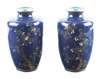 each with flared neck above shouldered slightly tapering cylindrical body, decorated with prunus blossom and birds in flight, on a dark blue ground, lozenge mark to base (2)