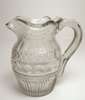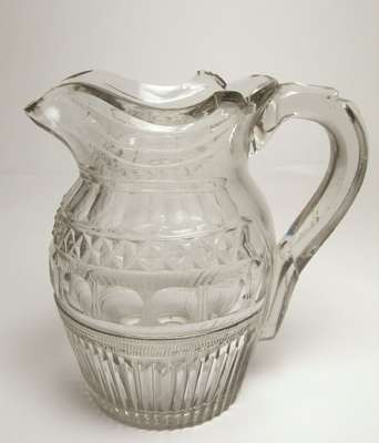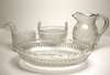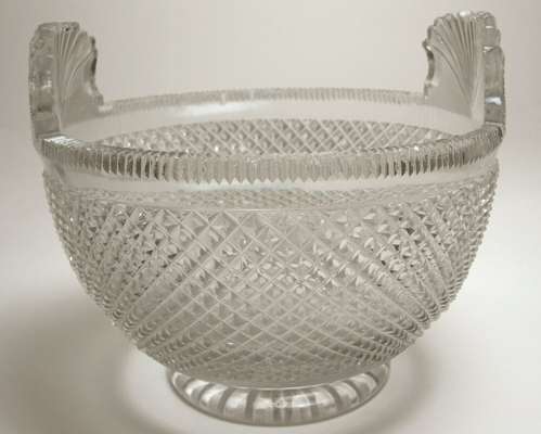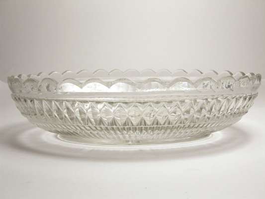 with hobnail cut circular bowl and fan cut arched handle and star cut base, 11.5cm diameter; an Irish cut glass bowl with twin fan cut handles, hobnail cut bowl and star cut base, 15cm diameter; an oval cut glass Irish epergne dish, circa 1800, with scalloped rim, diamond cut border and star cut base, 27cm wide; and an Irish cut glass water jug, Waterford/Cork, circa 1820 with applied strap handle, hobnail cut and thumb cut borders above fluted lower portion, 18cm high (4)