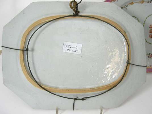 each of octagonal form with pink diaper work border and gilt swags, the well with three oval panels containing: a lion rampant holding a sword; three lions passant; and the initials TL surrounded by flowers (2)