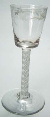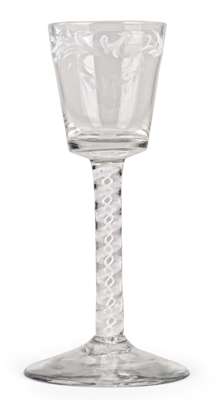 with unusual bucket shaped bowl, enamelled with a band of scrolling flowers and foliage above stem with double opaque white twist surrounded by white gauze twist above conical foot
