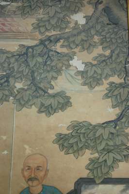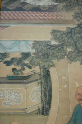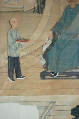 depicting and attendant serving his elderly master on a terrace with the house and a tree in the background