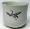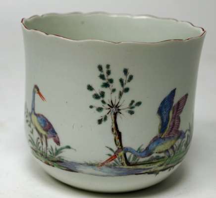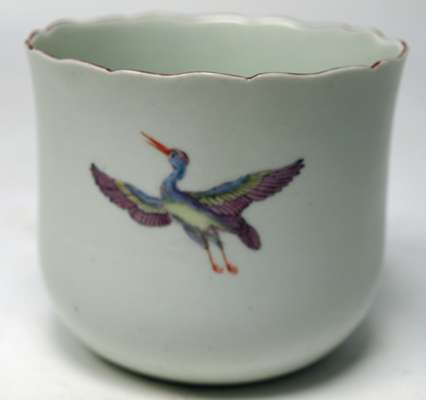 each bowl with scalloped rim and cylindrical slightly waisted body, decorated with three exotic birds at a river with a tree, the scalloped stands similarly decorated (4)