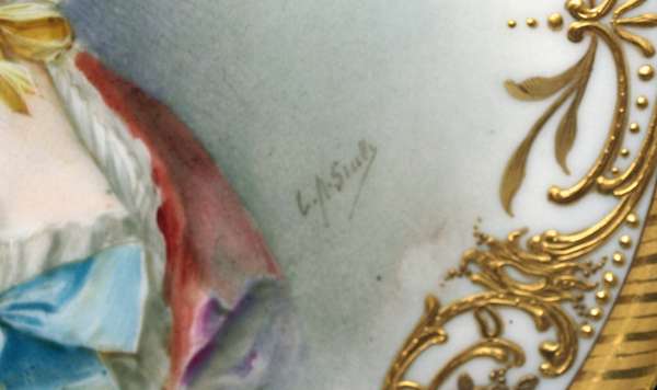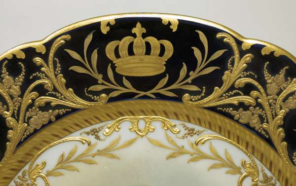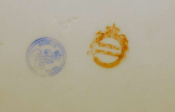 with a dark blue and gilt scroll decorated border with a coronet above and 'Pompadour' below, including fleur-de-lys, the well painted with Madame de Pompadour and signed, blue printed mark and date 1848, and red printed 'Chateau Fountainbleu' mark