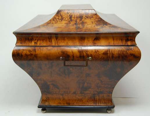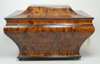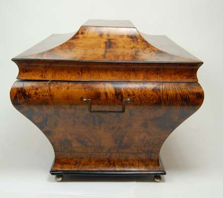 of sarcophagus form and with side carrying handles, the hinged lid opening to reveal a plush lined interior, raised on silvered bun feet