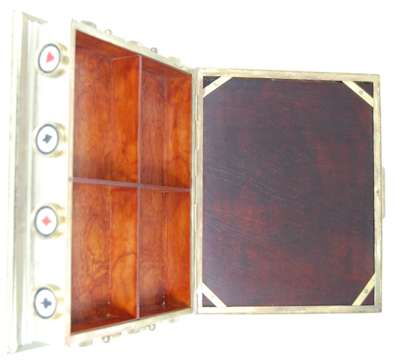 with side carrying handles, the hinged lid inset with panel decorated with playing cards and gaming counters, opening to reveal a compartmented interior, the sides inset with roundels, raised on a moulded base