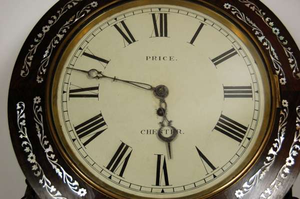 EARLY VICTORIAN ROSEWOOD AND MOTHER OF PEARL INLAID HANGING WALL CLOCK