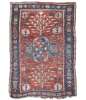 the red field with Karabagh style medallion flanked by two ivory trees, within indigo rosette border between pyramid bands
