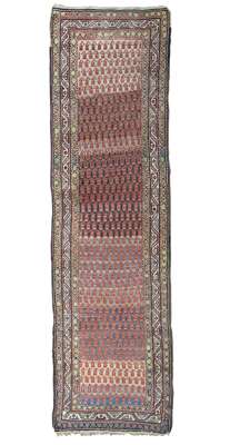 the abrash blue field with allover boteh pattern, within ivory vine border between green bands