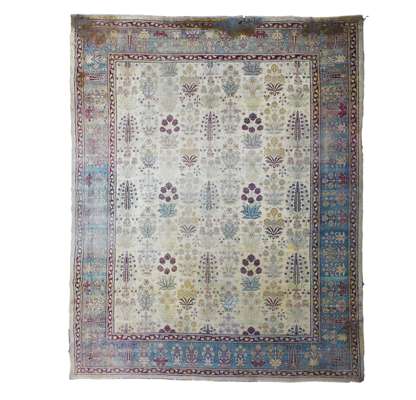 the ivory field with allover Mughal flower and tree pattern, within similar blue border between burgundy bands (worn)