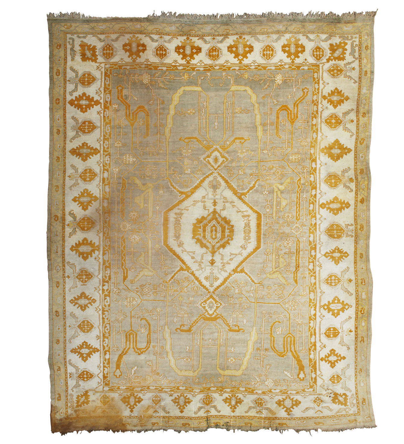 the slate grey field with ivory and orange lozenge medallion, within ivory rosette and palmette border between orange and lemon bands