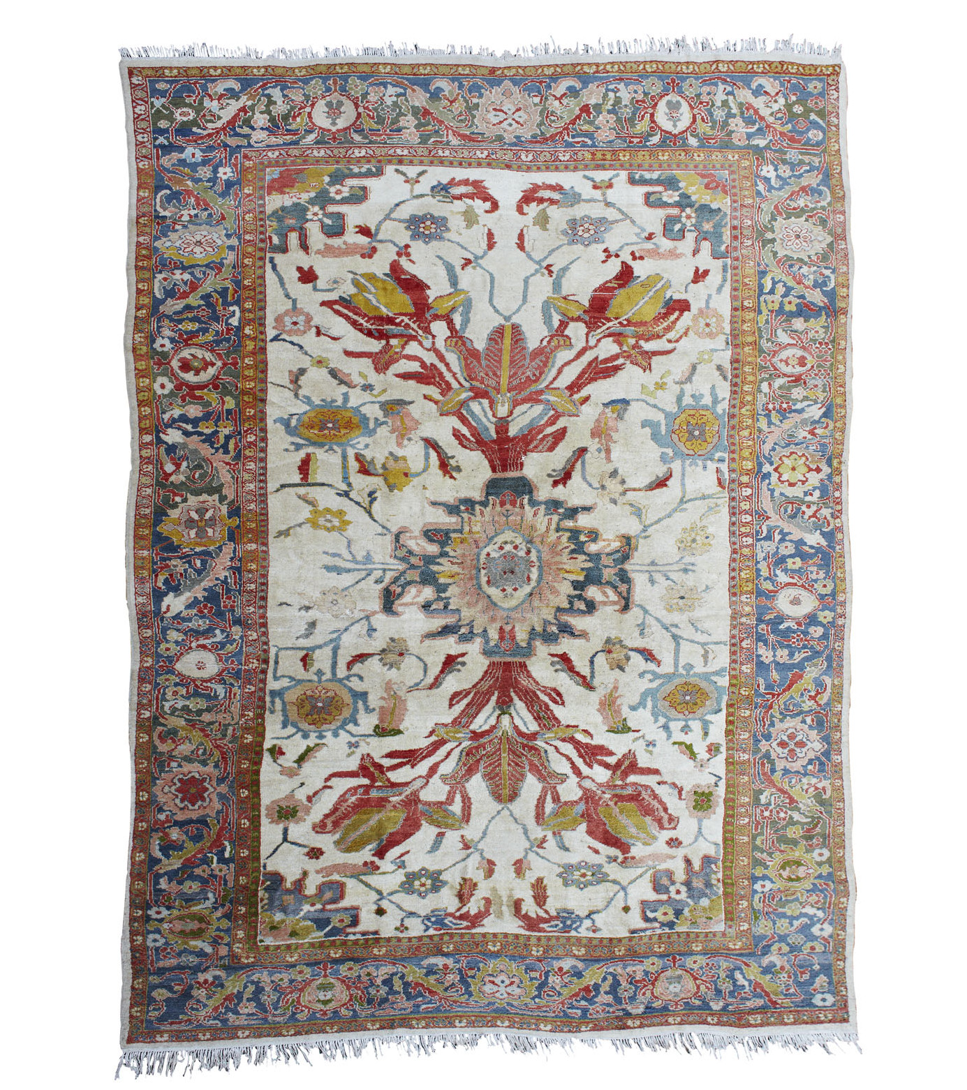the ivory field with indigo medallion issuing four diagonal large red floral shoots, indigo spandrels, within indigo palmette and vine border between red bands