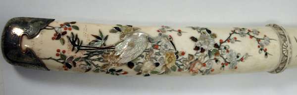 with white metal floral engraved mounts, profusely decorated with a crane amongst prunus and other blossom to one side and a partridge amongst chrysanthemum blossom and bamboo to the other (losses)