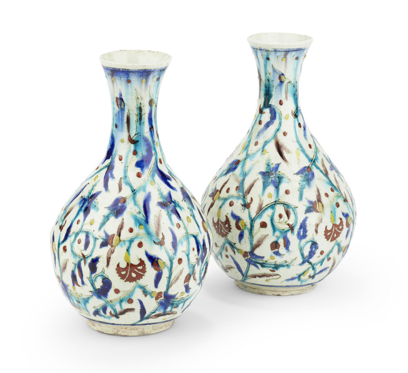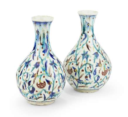 each with flared neck above ovoid body, decorated with trailing stylised flowers and foliage in turquoise, blue, iron red and yellow (2)