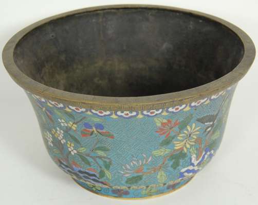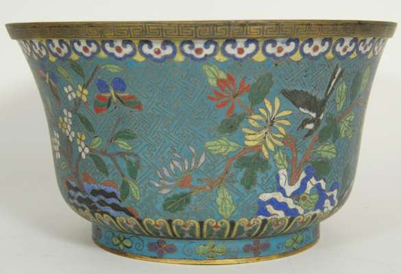 of circular form, decorated with polychrome flowers, butterflies and rockwork on a turquoise ground with geometric patterns