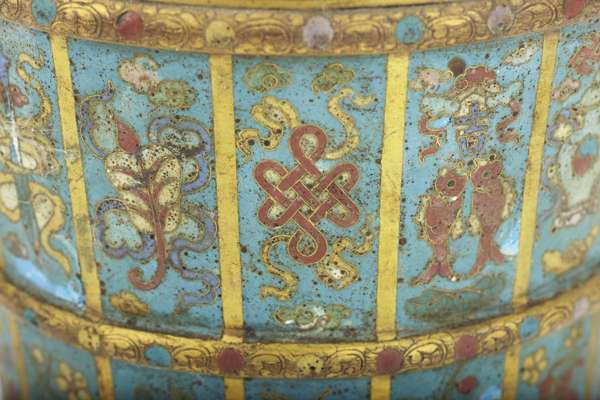 of slightly tapering cylindrical form, raised on three feet, with gilt metal bands each containing panels of good luck symbols and flowers on a turquoise ground
