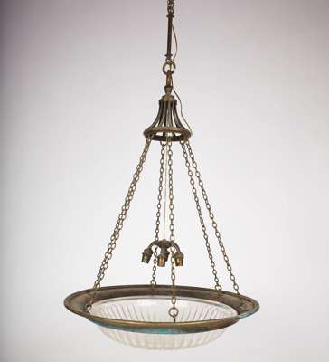 the fluted glass shade on a basket form apron supported by four link chains and a moulded circular corona