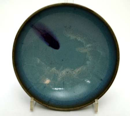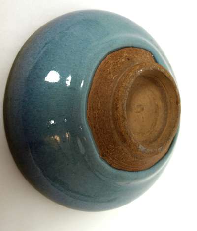 with a strong purple splash to the interior, the thick glassy glaze stopping short of the buff stoneware indented base