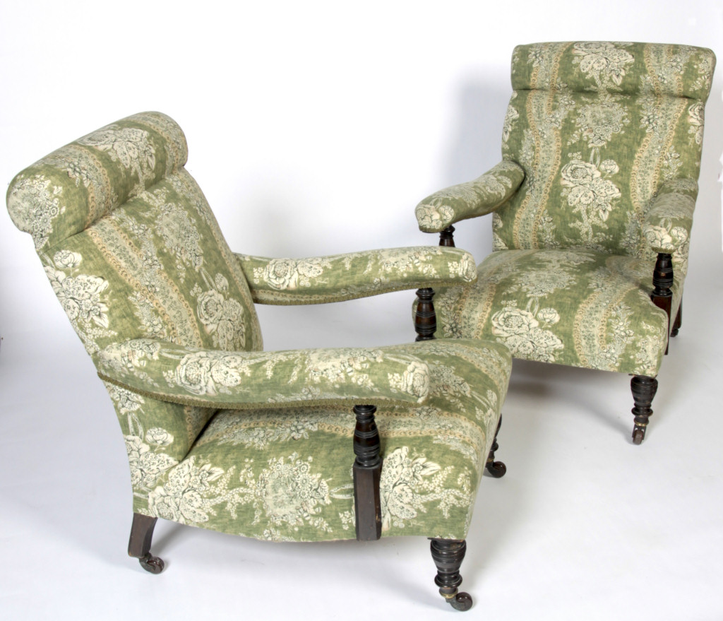 PAIR OF VICTORIAN WALNUT UPHOLSTERED ARMCHAIRS