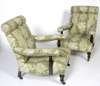 the scroll backs, downswept arms and stuffed over seats covered in green foliate patterned fabric, raised on turned tapered legs ending in castors (2)