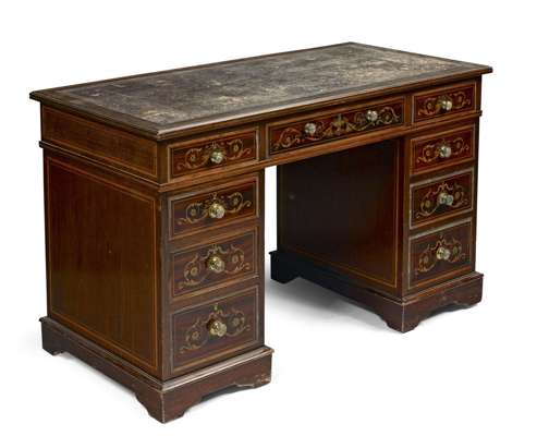 EDWARDIAN MAHOGANY AND MARQUETRY PEDESTAL DESK
