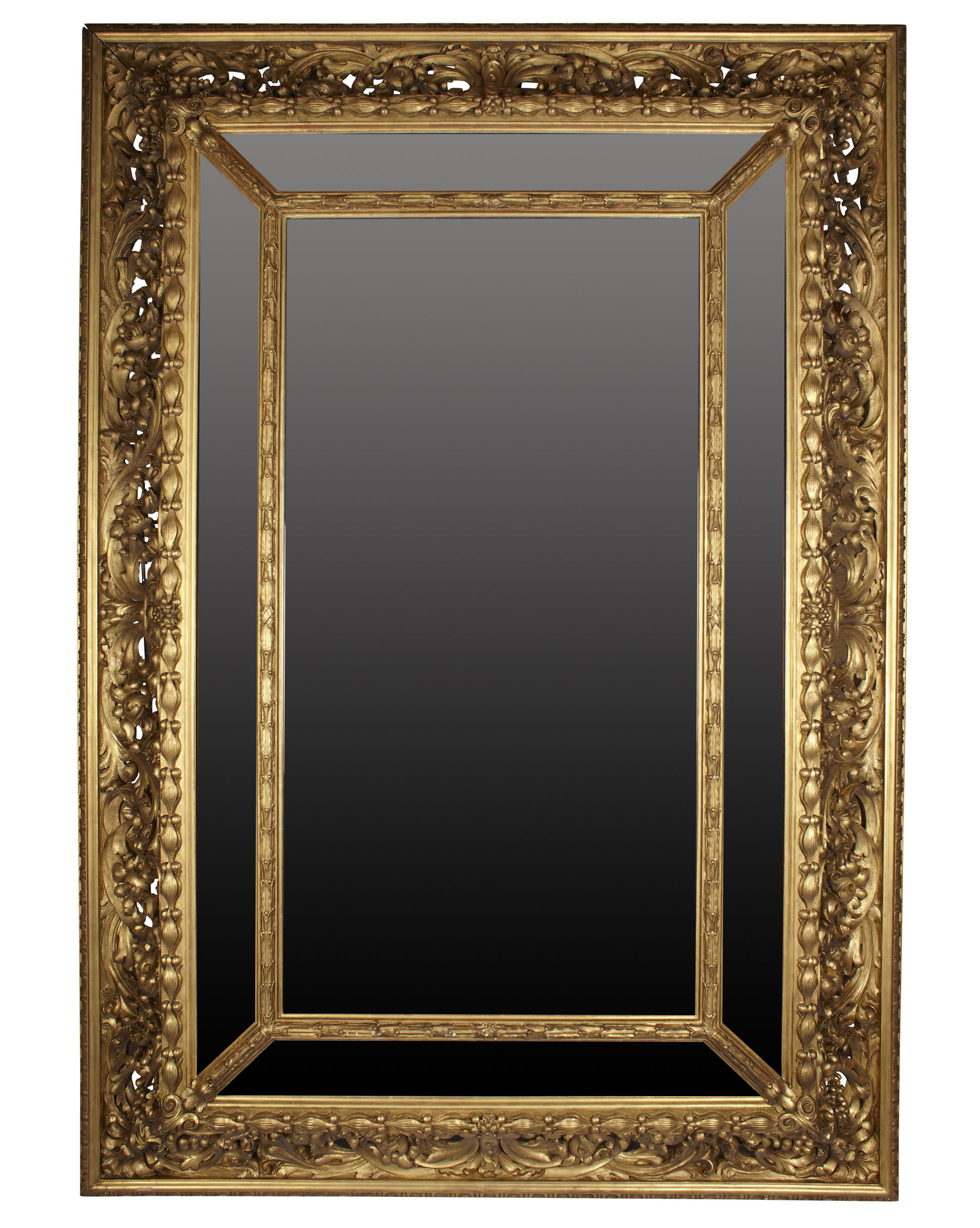 the bevelled rectangular plate and four further margin plates, within an ornate openwork fruit and foliate scroll carved frame