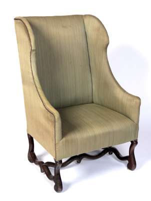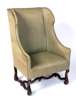 WALNUT AND UPHOLSTERED WING ARMCHAIR
