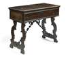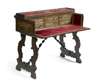the fold open rectangular top enclosing a fitted interior with six tapestry inset drawers, raised on twin openwork shaped end supports united by iron work stretchers
