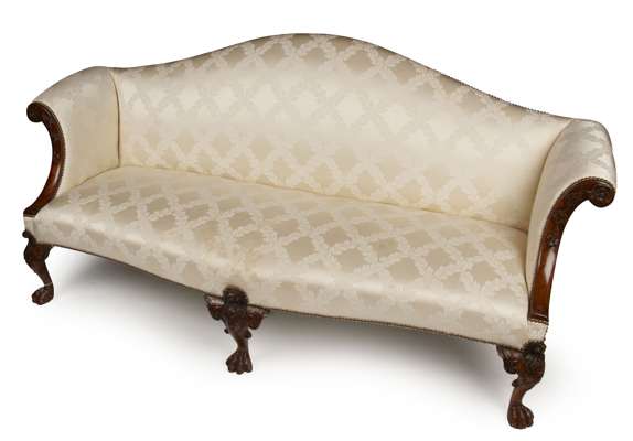 the domed back, padded outscrolling arms and serpentine seat covered in cream foliate patterned fabric, raised on carved cabriole legs ending in paw feet