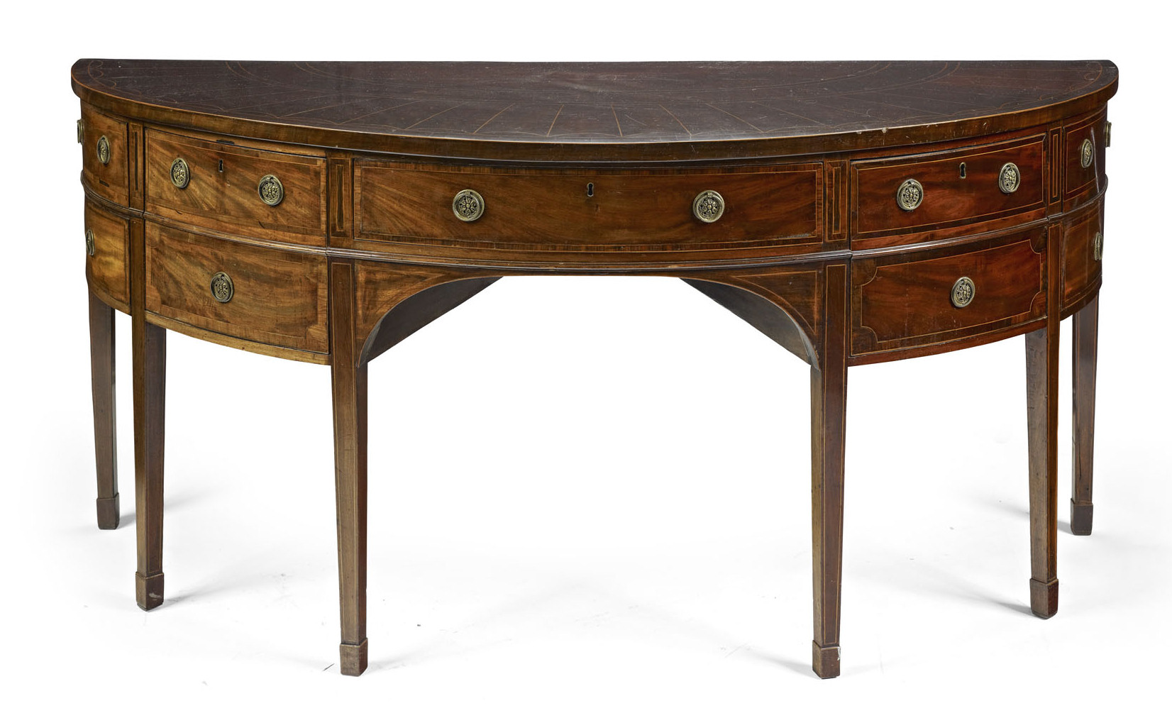 the shaped top with radiating veneers, above one central crossbanded drawer, flanked by two further conforming deep drawers, modelled as two, raised on square tapered legs ending in spade feet