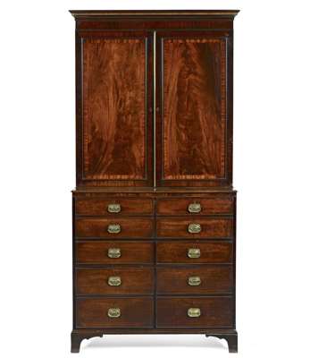 the simulated dentil moulded cornice above a pair of crossbanded panel cupboard doors, opening to reveal adjustable shelves, the lower section fall front drawer enclosing a fitted interior with pigeon holes drawers and an inset baize writing surface, above six further short drawers, raised on shaped bracket feet