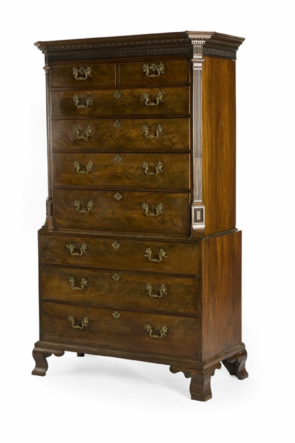 the fluted dentil cornice above two short and seven long graduated and cockbeaded drawers, between stop-fluted upper angles, with gilt metal rocaille cast handles, on splayed ogee bracket feet