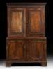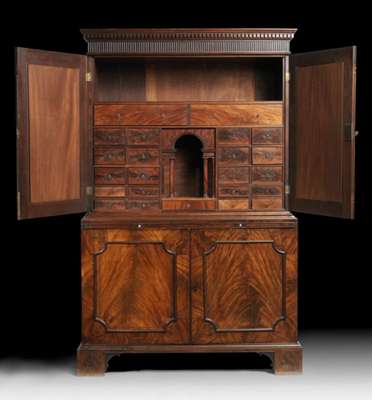 the dentil cut moulded cornice above a fluted frieze and a pair of flame veneered panel cupboard doors with fluted bands and corner paterae, the interior with an upper shelf above two drawers and a central removable architectural recess including a lower ink bottle drawer, flanked by twenty graduated small drawers, the lower section with a green baize inset writing slide and a pair of panel cupboard doors enclosing two adjustable shelves, on banded bracket feet with spandrels
