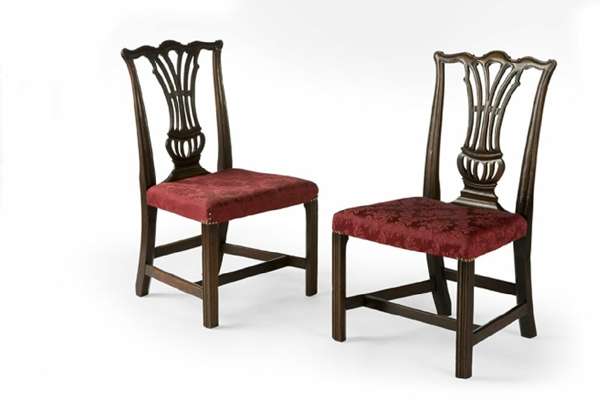 the C-scroll carved serpentine top rails above pierced vase-shaped splats and stuffed over seats upholstered in red damask, on chamfered and moulded square section legs united by stretchers (2)