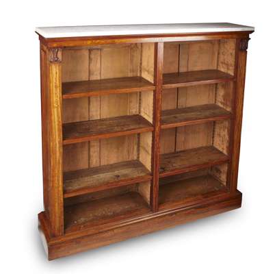 the white marble top above open adjustable shelves, flanked by stylised Doric pilasters, raised on a moulded plinth base