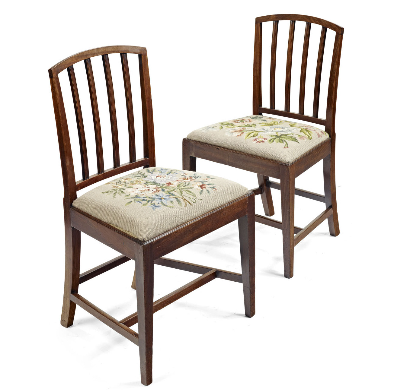 the arched brander backs above foliate woolwork drop-in seats, raised on square tapered legs united by H-stretchers