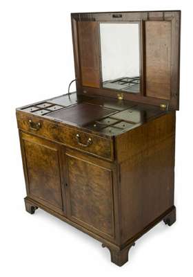the hinged top with moulded edge revealing a swing mirror and fitted drawer enclosing eleven lidded compartments with ivory handles around a well with writing slope, the two cupboard doors enclosing four short drawers above a void, on incised and scroll carved bracket feet