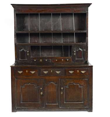 the shelved superstructure with a moulded cornice and two central apron drawers, flanked by a pair of fielded panel doors, the lower section with three further frieze drawers over two arched fielded panel doors, raised on stile feet