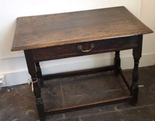the rectangular plank top above one frieze drawer raised on baluster turned legs united by peripheral stretchers
