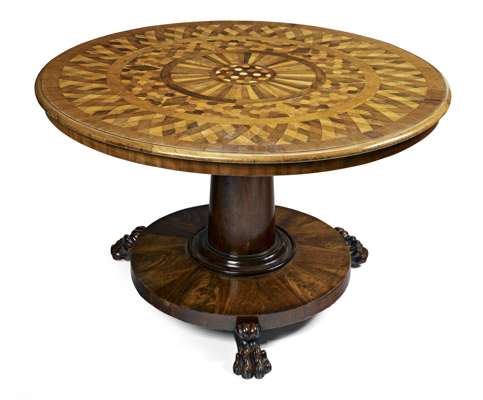 GOOD GEORGE IV SPECIMEN WOOD AND MAHOGANY BREAKFAST TABLE