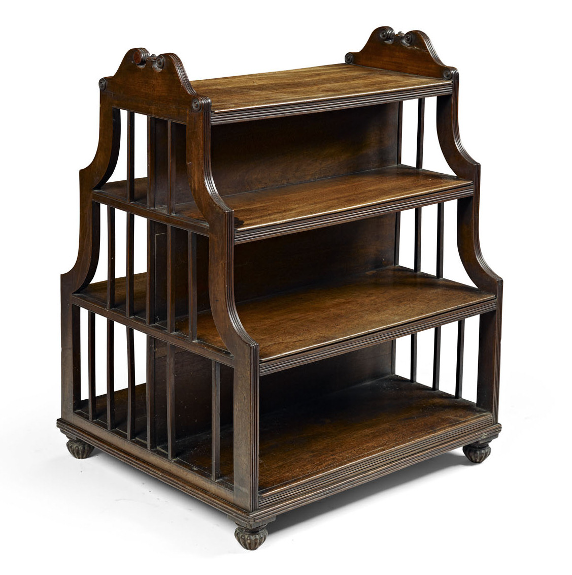 the openwork spindle shaped and reeded end supports united by graduated tiers, raised on lobed bun feet